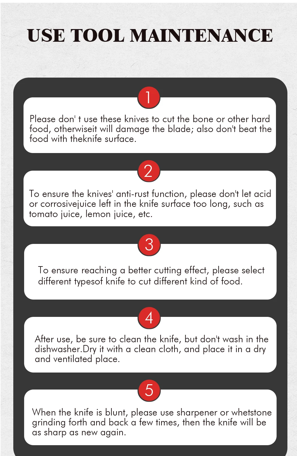 NOTE: Suitable for daily kitchen cooking, cutting meat, slices, vegetables melons etc.(don't use it cut the bone or other hard food)