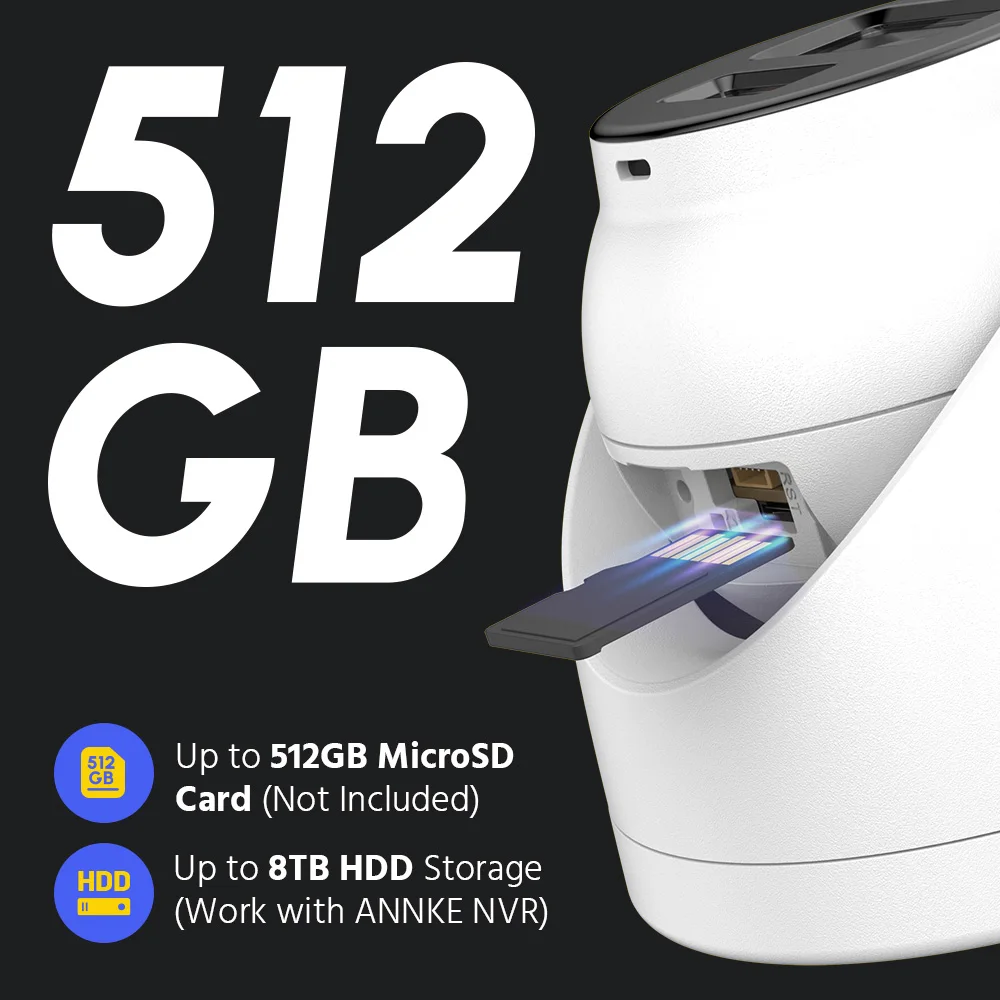 The camera not only supports up to 512GB microSD card(not included) to store but NVR recording. ANNKE NVR works best with this 12MP PoE camera, which can let you enjoy crystal-clear image quality without distortion, extra-long recording and use less bandwidth.