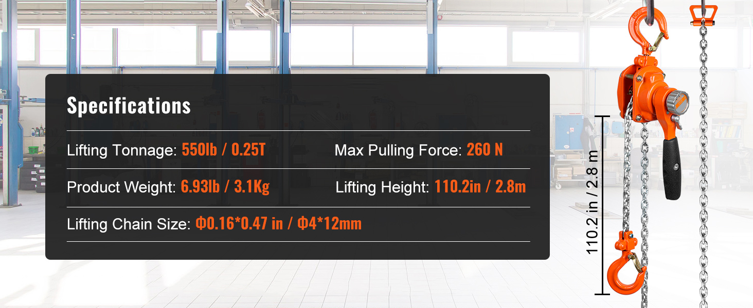 • Advanced Brake System:Featuring a Weston dual-pawl brake system, this hoist improves load safety by distributing weight across the gears. The industrial-grade alloy steel hook rotates 360°, facilitating effortless and secure lifting.